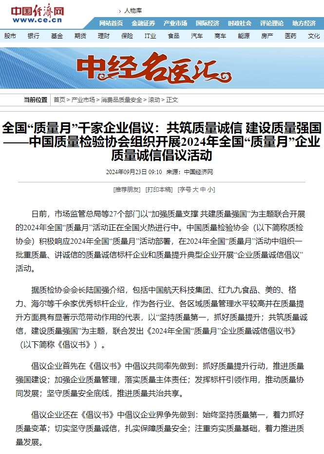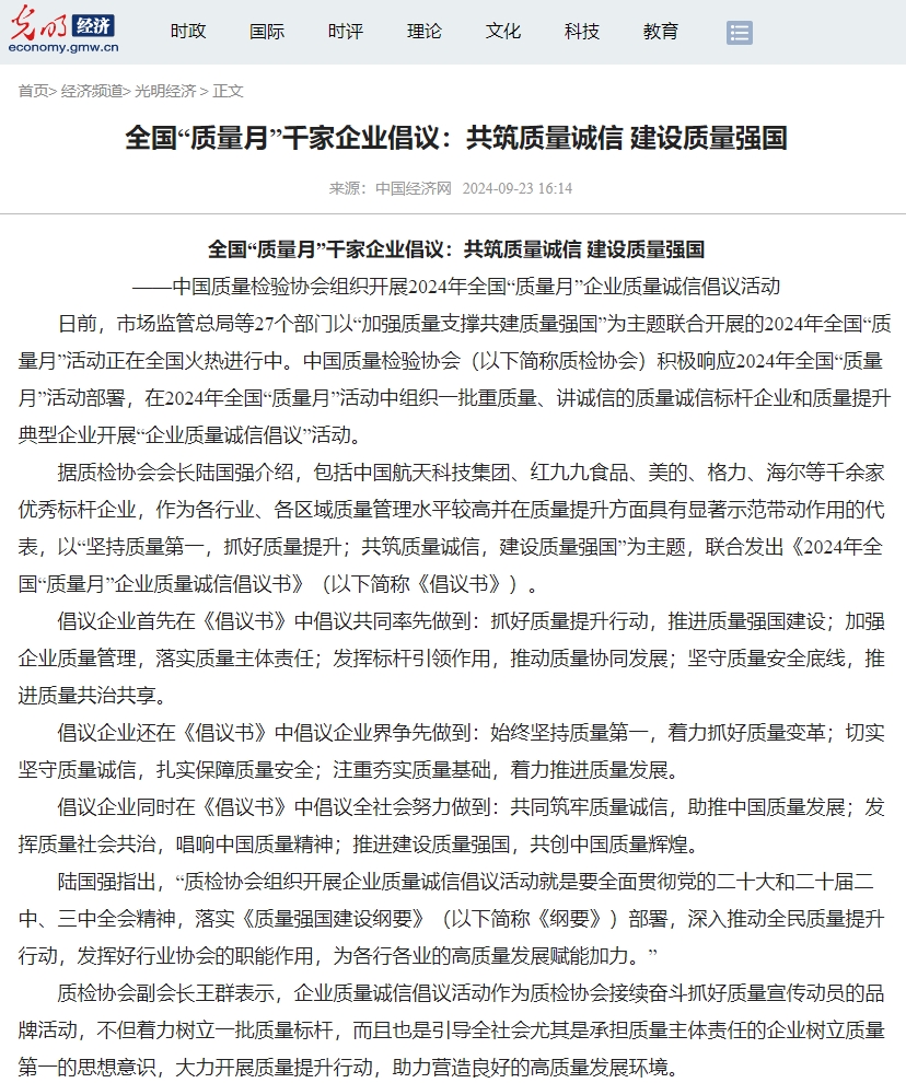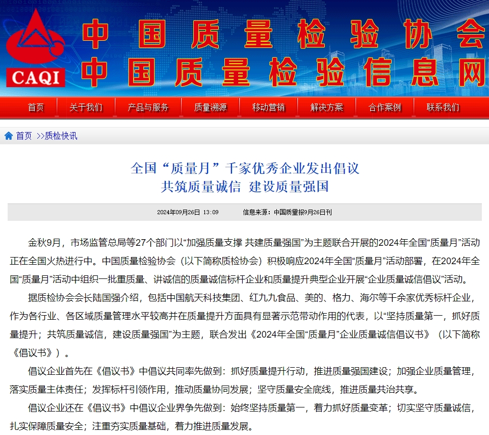 每年9月是全國“質量月”,由市場監(jiān)管總局等27個部門以“加強質量支撐 共建質量強國”為主題,聯(lián)合開展的“質量月”活動。在2024年全國“質量月”活動中組織一批重質量、講誠信的質量誠信標桿企業(yè)和質量提升典型企業(yè)開展“企業(yè)質量誠信倡議”活動。 其中,包括重慶紅九九食品等千余家優(yōu)秀標桿企業(yè),以“堅持質量第一,抓好質量提升;共筑質量誠信,建設質量強國”為主題,聯(lián)合發(fā)出《2024年全國“質量月”企業(yè)質量誠信倡議書》(以下簡稱《倡議書》)。 倡議企業(yè)首先在《倡議書》中倡議共同率先做到:抓好質量提升行動,推進質量強國建設;加強企業(yè)質量管理,落實質量主體責任;發(fā)揮標桿引領作用,推動質量協(xié)同發(fā)展;堅守質量安全底線,推進質量共治共享。 倡議企業(yè)還在《倡議書》中倡議企業(yè)界爭先做到:始終堅持質量第一,著力抓好質量變革;切實堅守質量誠信,扎實保障質量安全;注重夯實質量基礎,著力推進質量發(fā)展。 倡議企業(yè)同時在《倡議書》中倡議全社會努力做到:共同筑牢質量誠信,助推中國質量發(fā)展;發(fā)揮質量社會共治,唱響中國質量精神;推進建設質量強國,共創(chuàng)中國質量輝煌。 (中國經(jīng)濟網(wǎng)報道)